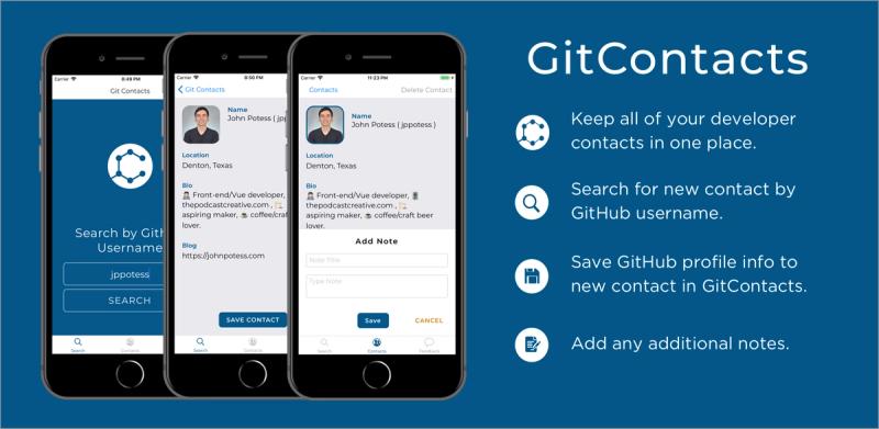 GitContacts is an iOS and Google Play mobile app that allows you to search and add new contacts by their GitHub username. Newly saved contacts are automatically populated with that GitHub user's profile information.